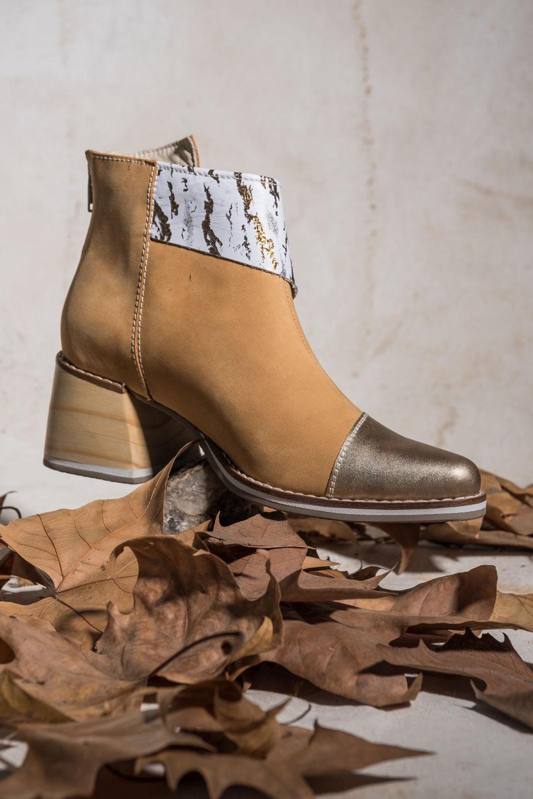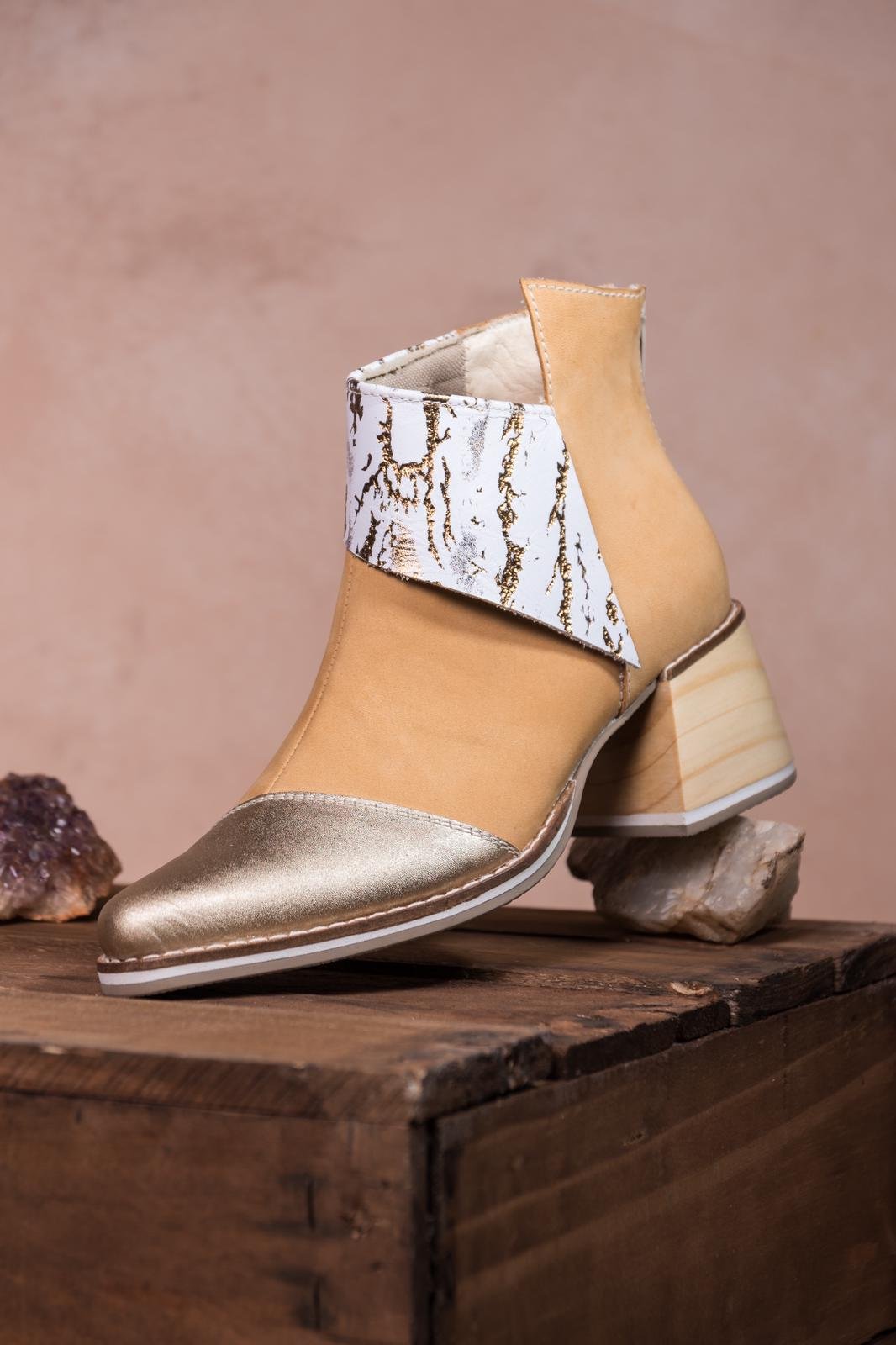 Botín en cuero combinado color camel, con puntera en oro metalizado y cuero blanco con diseños metalizados también.