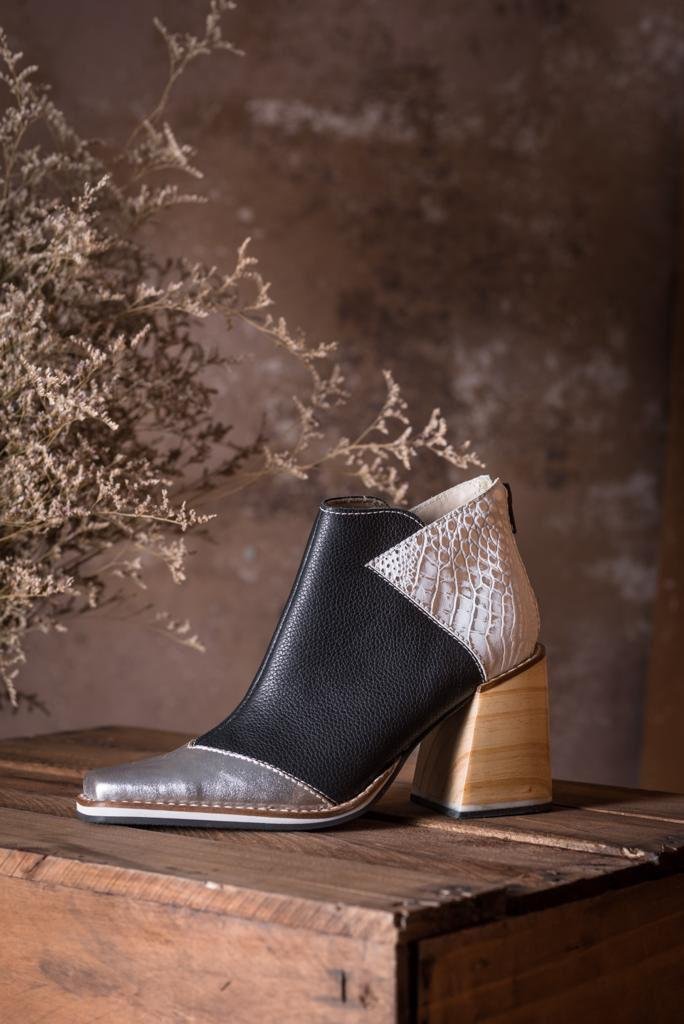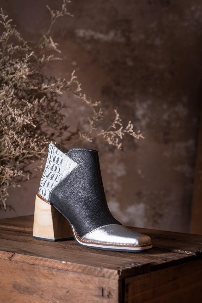 Botín en cuero negro, con puntera en tono plata y detalle en croco blanco con detalles metalizados. Cierre trasero para un calce cómodo y taco medio-alto forrado en madera clara, que le suma calidez y estilo contemporáneo.