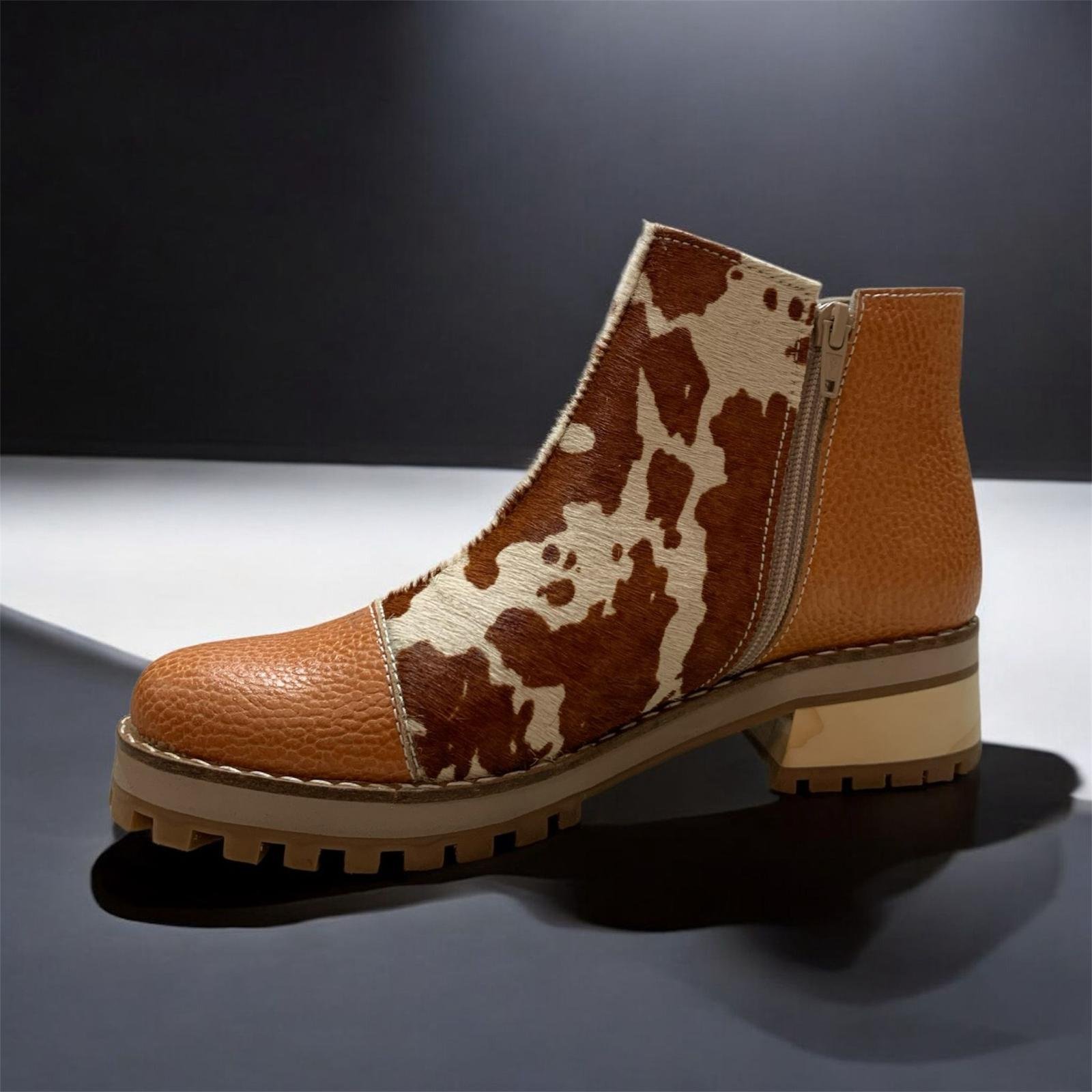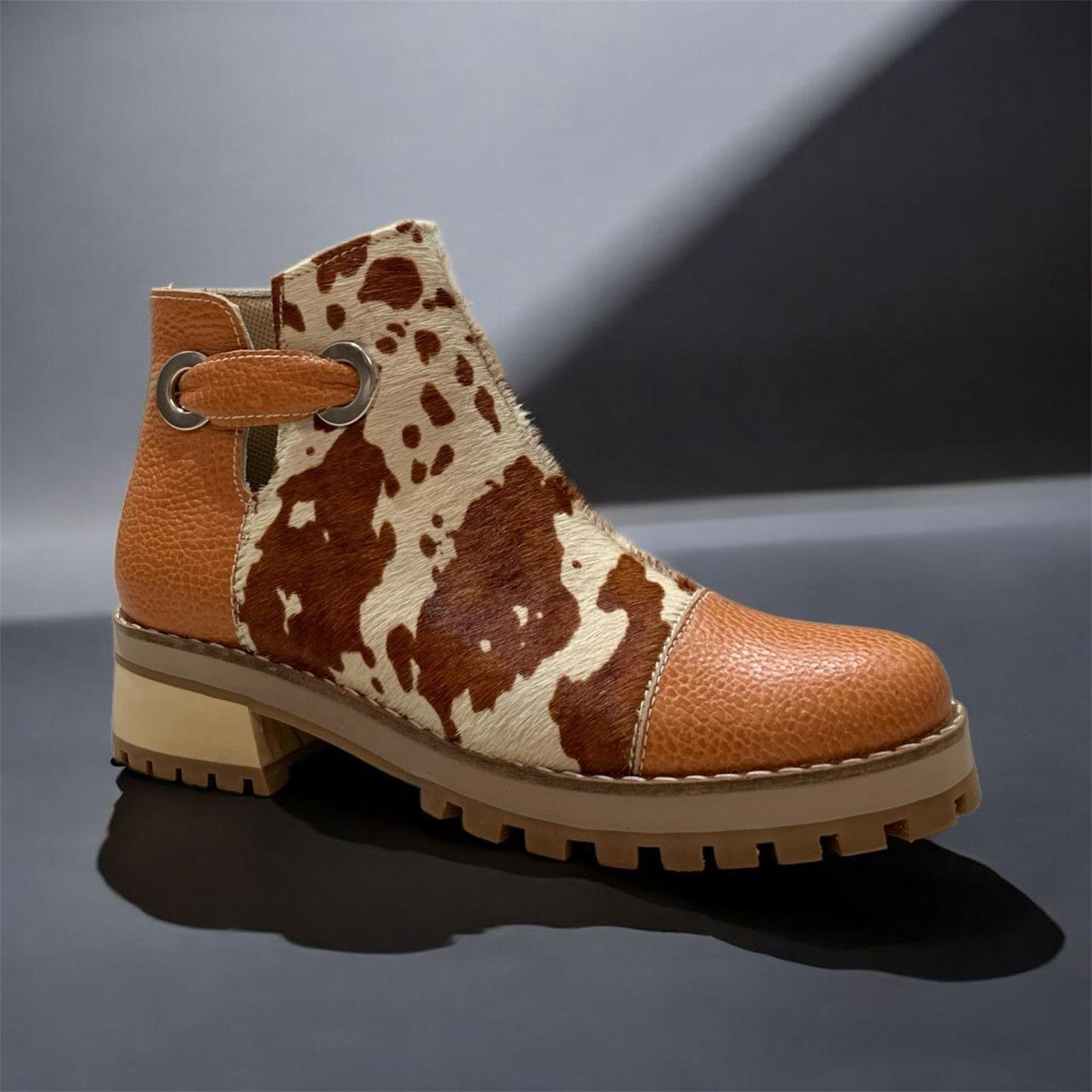 Botín estilo western en cuero graneado color caramelo y cuero pelo con estampado cow print